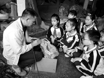 11月9日,会同县梁铭驿小学思政教育名师工作室组织学生走进会同县坪村镇张劲“会同木雕”工作室,开展“童心爱‘非遗’”研学活动。图为“非遗”传承人为学生讲解木雕。