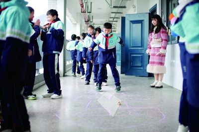 2月17日,吉首市乾雅小学迎来开学第一天。新学期,课间休息时间延长至15分钟,该校开展了挑花绳、“跳房子”等民间传统游戏。图为师生一起玩“跳房子”。 洪莹霞 摄影报道