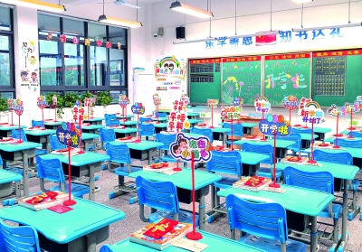 长沙市开福区浏阳河小学教室被装点得焕然一新,整齐码放的新教材静候小主人认领。