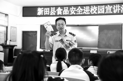 近日,新田县教育局和县市场监督管理局联合开展“食品安全进校园”活动,通过讲解如何辨识“三无”、过期食品等常识,增强学生食品安全意识,筑牢食品安全防线。图为市场监督管理局的工作人员向学生讲解食品安全常识。 刘贵雄 摄影报道
