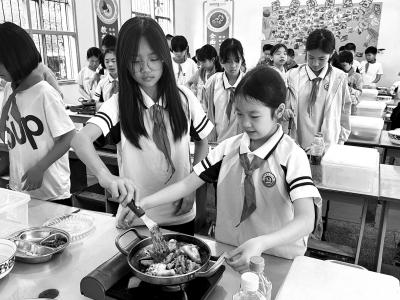 5月9日上午,东安县在横塘学校开展劳动教育现场会,19所学校代表走进该校,共探劳动教育落地路径。图为学生在展示烹饪技能。