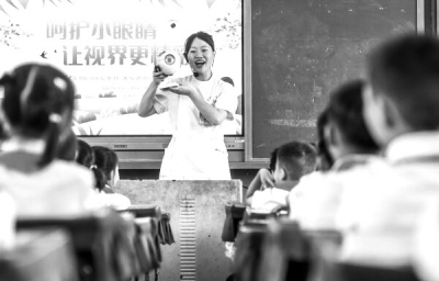 6月6日,道县第四小学,医护人员在为学生讲解护眼知识。当天是全国爱眼日,该县各学校开展爱眼护眼主题活动,向孩子们普及科学用眼知识,增强爱眼护眼意识。