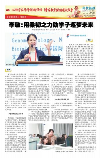 李敏,女,汉族,1978年4月出生,中共党员,中南大学计算机学院教授,国家杰出青年科学基金获得者。她聚焦生物医学大数据处理前沿,探索“学科交叉+个性定制+创新训练”新工科育人模式。其主讲课程获评湖南省研究生精品示范课程,指导学生多次在国内外重要竞赛中获奖,培养硕博研究生50余名,被评为湖南省首届优秀研究生导师。她潜心科研攻关,研究成果在多个领域得到应用,获第十九届中国青年女科学家奖等荣誉。2025年,李敏荣获湖南省最美教师。