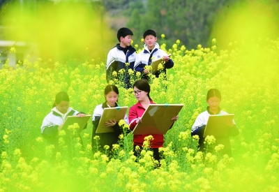 3月10日,嘉禾县第七中学把美术课堂搬到田间,组织学生走进油菜花海,用手中画笔描绘多彩春色,感受春日美好。 黄春涛 摄影报道