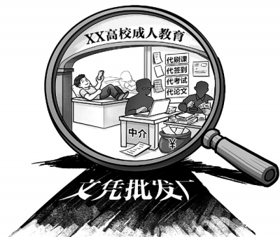 代刷课、代签到、论文代写……部分高校成人教育乱象频发,中介全程“托管”,高校却“睁只眼闭只眼”。学历沦为生意,文凭变成批发,不仅损害了高等教育的公平性和权威性,更透支了社会信任。对此,相关部门应当强化监管、严惩造假,让成人教育回归育人本真。