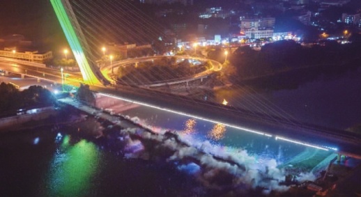 晚上11点01分,对讲机内,总指挥喊到:“五、四、三、二、一、起爆”一道电光闪过,洪山庙老桥应声塌掉。从爆破到桥体落下,用时3.5秒。
