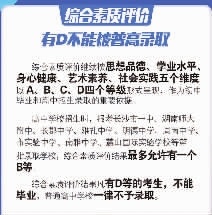 综合素质评价继续按原有五个维度以A、B、C、D四个等级呈现综合素质评价结果,作为初中毕业和高中招生录取的重要依据。同时,继续实施“初中学业水平考试成绩+综合素质评价”录取办法。