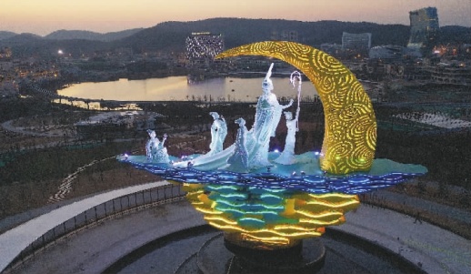 1月11日晚,长沙大王山旅游度假区湘江女神公园项目现场,在灯光的变幻下,湘江女神雕塑绽放出璀璨的光芒。该公园取名自楚国伟大诗人屈原的作品《九歌·湘夫人》,公园最高处的山顶设湘江女神雕塑。当晚,主雕塑灯光调试完成。据了解,一个完整的灯光演绎过程约8分钟,通过光线变化和光源的切换来表现湘夫人泛舟江上,久等湘君不来,由满心欢喜的期待到见而不得之后怅然离去的失落情绪。