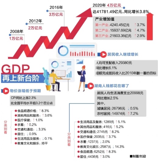 湖南地区生产总值突破4万亿元,同比增长3.8%;我省居民人均可支配收入29380元,比上年增长6.1%;全省CPI同比上涨2.3%,低于上年2.9%的涨幅……临近年关,好消息不断。1月19日上午,在省政府新闻办公室召开的新闻发布会上,省统计局和国家统计局湖南调查总队联合发布2020年湖南经济和社会发展“成绩单”以及民生调查数据。
