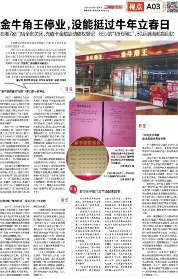 2月3日,立春。有点儿出乎意料的,成立于2001年的长沙金牛角王中西餐厅关闭了在湘的所有门店,贴出了《暂停营业公告》及《关于顾客充值卡的通知》,对充值的消费者给出了“充值卡待门店恢复营业后继续使用或申请债权登记”两种解决方案(扫报眉二维码看现场视频)。