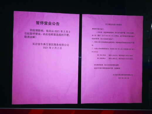 2月3日,落款显示为长沙金牛角王餐饮服务有限公司的《暂停营业公告》以及《关于顾客充值卡的通知》在网上广为流传。落款日期为2021年2月2日的《暂停营业公告》上提到:“我司从2021年2月3日起暂停营业,由此给顾客造成的不便,敬请谅解!”
