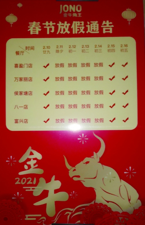 为了一探究竟,三湘都市报记者前往金牛角王中西餐厅八一店。门店所在的四楼漆黑一片,紧锁的大门上张贴着上述两则红底黑字的通知。门店外,供等位客人休息的沙发、茶几以及工作台、置物架等未来得及收走。就着手机摄像头的灯光,记者还看到一块“春节放假通知”的公告牌,告知消费者八一店、富兴店等5家门店的营业安排,将营业至2月10日,2月11日至2月14日(除夕至正月初三)放假。由此可见,金牛角王此次因亏损作出的全面停业决定非常突然。