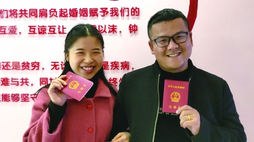 “恭喜你们成为了合法夫妻,新年快乐!”2月18日,长沙市天心区民政局婚姻登记处,张昴与爱人庄源从办证员手里接过结婚证,迎来甜蜜的新生活。张昴告诉记者,新春上班第一天就急着来领证,争取生个牛宝宝!