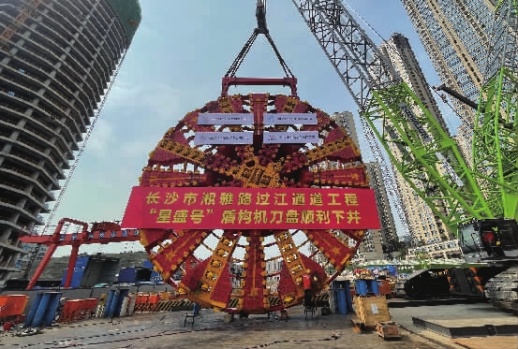 本报2月21日讯 今日,在长沙市岳麓区湘雅路过江通道项目部现场,直径15.01米,重量近500吨的“星盛号”盾构机刀盘顺利吊装进入盾构始发井,这意味着湖南省目前最大直径盾构机“星盛号”盾构机成功装上“巨牙”,也标志着湘雅路过江通道项目盾构机主机组装进入收尾阶段,迈入盾构始发倒计时。