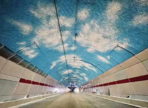 在长沙市岳麓区麓景路与梅溪湖路的交会处,一条穿过桃花岭公园连接含浦片区与梅溪湖片区的麓景路隧道正在加紧施工当中。这个隧道顶部喷涂“蓝天白云”图形,在满足防火功能的基础上又具备观赏性。