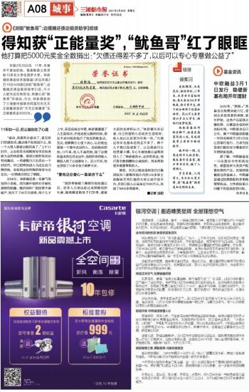 本报2月25日讯 11年,本身并不富裕的他,靠卖鱿鱼义务资助10多名大学生圆梦大学。林新德的事迹经本报报道(详见本报2月19日A08版《浏阳“鱿鱼哥”:边摆摊还债边捐资助学》)后,不少人都为这位有担当、有爱心的“鱿鱼哥”所感动。今日,林新德收到了三湘都市报联合阿里巴巴天天正能量颁发的“天天正能量奖”及正能量奖金5000元。