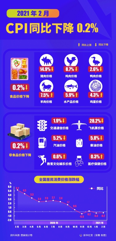 国家统计局3月10日发布的数据显示,2月份,全国居民消费价格指数(CPI)同比下降0.2%。“2月份CPI同比下降,主要是受春节错月和去年同期高基数效应的影响。”中国宏观经济研究院市场与价格研究所主任郭丽岩分析,在2月份0.2%的同比降幅中,新涨价影响约为1.6个百分点,去年价格变动的翘尾影响约为-1.8个百分点。