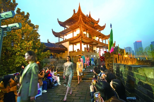 3月19日,长沙市天心阁,模特在古城墙上展示时尚潮流服饰。当天,由长沙市天心阁管理处、长沙王府井百货共同打造的2021长沙时装周首秀启幕。