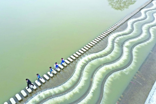 3月19日,蓝山县舜水河糯江段,塔峰镇第四完小的学生志愿者在河边清理白色垃圾。该校注重对学生的环保教育,经常开展各种劳动实践体验活动,培养学生的环保理念和意识。