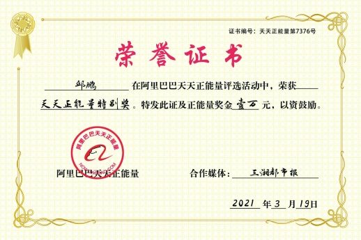 3月18日,在了解邱鹏的故事后,阿里巴巴天天正能量工作人员致电三湘都市报,双方共同商定授予邱鹏“天天正能量特别奖”,并奖励1万元正能量奖金,帮助他实现自己的心愿。