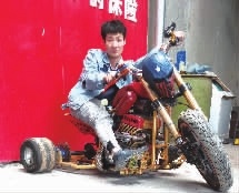 本报4月11日讯 漂移炫技,玩改装车,相信这是很多男孩都曾经有过的梦想。在永州江华,30岁的杨斌完成了这个梦想。他花了2个月的时间将一辆摩托车改造成了可以漂移的超酷三轮卡丁车。不仅外形酷炫,更有别出心裁的小设计。