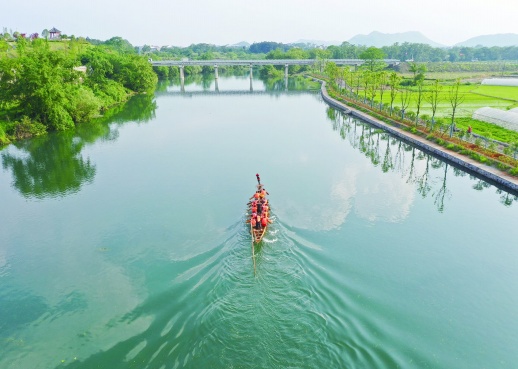 5月11日,一条龙舟行驶在道县何宝珍故里梅花镇贵头村洑水河河面。近年,该县认真落实湿地保护条例,依法加强生态保护,严格落实河长制要求,守护境内河道、湖泊一湾碧水,处处可见水清岸绿的生态美景。