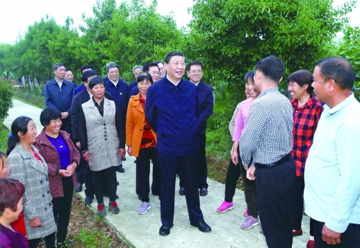 位于渠首附近的九重镇邹庄村共有175户750人,2011年6月因南水北调中线工程建设搬迁到这里。习近平走进利用南水北调移民村产业发展资金建立起来的丹江绿色果蔬园基地,实地察看猕猴桃长势,详细了解移民就业、增收情况。听说全村300余人从事果蔬产业,人均月收入2000元以上,习近平十分高兴。他强调,要继续做好移民安置后续帮扶工作,全面推进乡村振兴,种田务农、外出务工、发展新业态一起抓,多措并举畅通增收渠道,确保搬迁群众稳得住、能发展、可致富。随后,习近平步行察看村容村貌,并到移民户邹新曾家中看望,同一家三代围坐在一起聊家常。邹新曾告诉总书记,搬到这里后,除了种庄稼,还在村镇就近打工,住房、医疗、小孩上学也都有保障。习近平指出,人民就是江山,共产党打江山、守江山,守的是人民的心,为的是让人民过上好日子。我们党的百年奋斗史就是为人民谋幸福的历史。要发挥好基层党组织的作用和党员干部的作用,落实好“四议两公开”,完善村级治理,团结带领群众向着共同富裕目标稳步前行。离开村子时,村民们来到路旁同总书记道别。习近平向为南水北调工程付出心血和汗水的建设者和运行管理人员,向为“一泓清水北上”作出无私奉献的移民群众表示衷心的感谢和诚挚的问候。他祝愿乡亲们日子越来越兴旺,芝麻开花节节高。