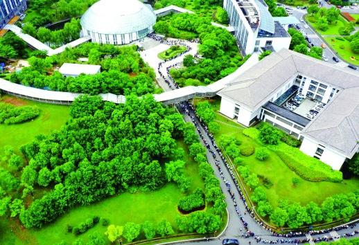 5月14日晚,安徽省及六安市召开疫情防控新闻发布会,发布会上通报,5月13日,安徽合肥市、六安市两地相继出现新冠肺炎疫情。截至5月14日23时,全省共报告确诊病例5例(合肥市2例,六安市3例)。另据辽宁营口市疫情防控新闻发布会通报,当地5月14日新增2例确诊病例。图为5月14日,在安徽省六安市行政中心大会堂检测点,市民排队等待进行核酸检测(无人机照片)。 ■据新华社