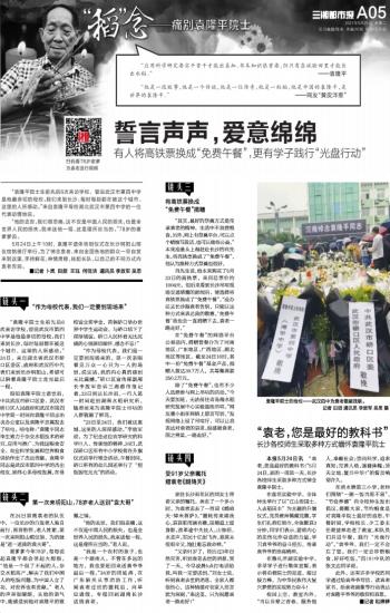本报5月24日讯  “袁老,您是最好的教科书!”5月24日,新的一周第一天,长沙各校师生采取多种方式悼念袁隆平院士。