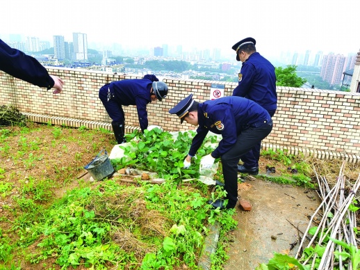当天,近30名执法工作人员使用器械拆除违建违搭棚子、清理果蔬及杂物。得益于前期多次的疏导工作,整改当天,当事人全程未进行阻拦或对抗,期间还自主协助整治人员一并清理现场,并表示以后不会再私自占用楼顶平台。现场,大家共清理平台种菜25处、乱堆杂物12处、养殖(鱼)2处,高效快速地将400平方米的私建菜园整改完成。