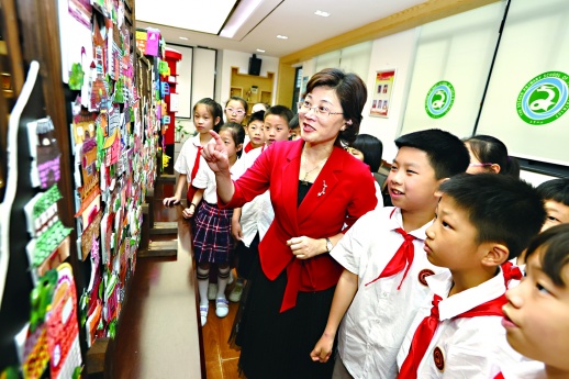5月28日,长沙市岳麓区第二小学,师生在交流创作心得。当天,该校开展“童心颂党,百年辉煌”主题文化墙创作比赛,师生围绕红船精神、井冈山精神等六个主题进行手工设计创作,让红色基因代代相传,迎接中国共产党成立100周年。