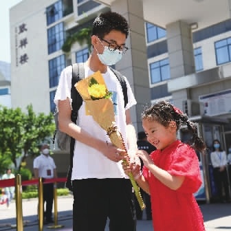 6月7日11时50分许,长沙市实验中学考点,首场考试结束后,6岁的何碧瑶小朋友给哥哥何智威送上一束向日葵,祝福哥哥高考胜利、“一举夺魁”(小图)。 湖南日报·新湖南客户端记者 田超 摄 |