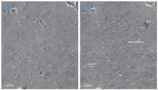 此外,着陆平台南北方向,存在对称的喷射状亮条纹,可能是着陆后着陆平台钝化时吹除了较细的尘埃形成。图像中部亮斑为降落火星过程中抛离的背罩及降落伞组合体,其中背罩为圆形亮点,降落伞为长条状亮点。图像左下方向,存在另外一处明显的亮斑,为降落过程中抛离的防热大底。