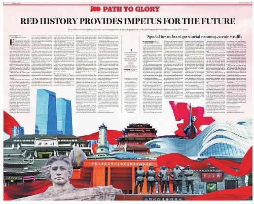 三湘大地深植红色基因。专刊二三版配以湖南红色地标建筑等大幅彩色照片,展示湖南作为伟人故里、红色圣地、革命摇篮,发扬革命传统,传承红色基因,牢记初心使命,走好新时代长征路。文章以“半条被子”故事发生地郴州汝城沙洲村、韶山等红色景点为例,讲述了湖南发挥革命遗址遗存、纪念场馆等的宣传教育功能,砥砺初心使命,打造红色旅游精品。特刊还讲述了湖南通过打造特色小镇,助力乡村振兴走上“快车道”。