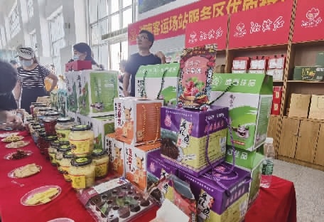 候车室内一侧的“湘赣红”农产品展销展示专柜处,糖醋蒜、豆腐乳、杨梅、鹅蛋等农副产品吸引不少旅客驻足咨询。