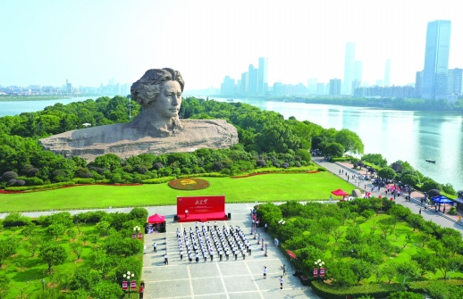 6月25日上午,长沙橘子洲头,来自省委宣传部、湖南日报社、湖南财政经济学院的党员干部及学生党员共100多人重温入党誓词。当天,由省委党史学习教育领导小组办公室指导,湖南日报·新湖南客户端和湖南财政经济学院联合主办的“庆祝建党百年 百人橘洲宣誓”暨《我宣誓——打卡红色地标 重温入党誓词》互动产品线下推广活动举行。 湖南日报·新湖南客户端 记者 田超 摄