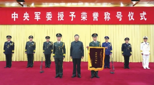 中央军委授予荣誉称号仪式7月5日在京隆重举行。中央军委主席习近平向获得荣誉称号的单位颁授奖旗。