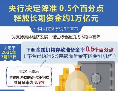 中国人民银行7月9日宣布,为支持实体经济发展,促进综合融资成本稳中有降,决定于2021年7月15日下调金融机构存款准备金率0.5个百分点。今年以来,部分大宗商品价格持续上涨,一些小微企业面临成本上升等经营困难。人民银行有关负责人表示,此次降准的目的是优化金融机构的资金结构,提升金融服务能力,更好支持实体经济。