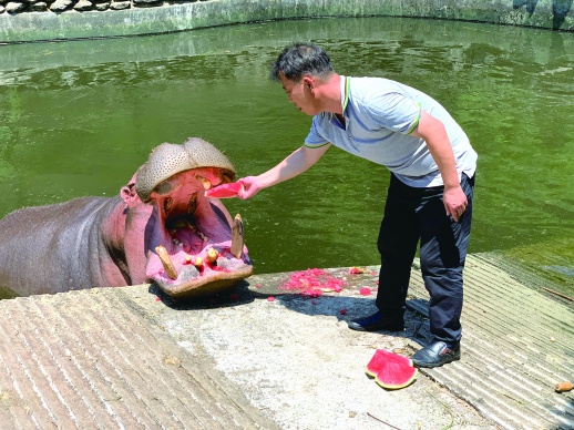 河马晶晶2016年来到长沙生态动物园,一直由冯洋负责照顾。“夏季天气炎热,动物也容易中暑,体型大的动物更是需要注意防暑。”冯洋介绍,一到夏季,河马馆水池里的水每隔4-5天就会更换一次,每天还会给晶晶投喂近80斤的西瓜、白菜、青菜等新鲜的消暑时令蔬果。