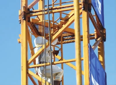 “前些天我们冒险摘掉蜂巢,没想到它们不屈不挠又重新筑了巢……”当日下午3时,在幸福家园工地,在塔吊驾驶室的下方有一个特别大的马蜂窝,之前工人自行处理过,没几天时间附近又重新筑了巢。因为筑巢位置不方便处理,又有马蜂在附近活动,于是报警求助。消防指战员穿着防蜂服、绑腰带、系安全绳,携带杀虫剂和袋子前往马蜂窝所在塔吊驾驶室下方平台,采用杀毒喷雾剂喷杀办法除蜂。