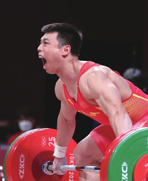 7月25日,中国选手谌利军在比赛中。当日,在东京奥运会举重男子67公斤级决赛中,中国选手谌利军夺冠。