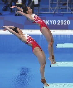 7月25日,在东京奥运会跳水女子双人三米跳板决赛中,中国选手施廷懋/王涵夺得冠军。