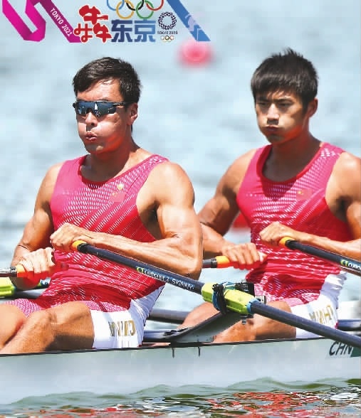 7月28日,张亮(左)和刘治宇在比赛中。当日,在东京奥运会赛艇项目男子双人双桨决赛中,中国组合张亮/刘治宇获得铜牌。 新华社 图
