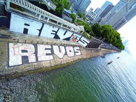上午10时许,记者赶到橘子洲大桥桥东,远远地看到此前巨幅袁隆平涂鸦墙,已被巨型“revos”字母组成的新涂鸦作品覆盖。除此之外,沿江栏杆扶手上也出现了不少“revos”的字样。