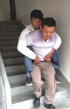 今年49岁的盛忠世身高才1.62米,年近古稀的钟祥耀老人高出他一个头。矮个背高个本来就难,钟祥耀还是重症尿毒症患者,早就没有支撑身子的能力。盛忠世只能最大限度让自己的上身向前倾斜,以便钟祥耀老人把双臂耷拉在他的双肩上,再用自己的双手用力挽住老人的双腿,一步一步艰难前行。终于到家了,放下老人,盛忠世喘着粗气道了别后才回家:“钟叔,您早点休息吧,3天后我再准时来接您去医院。”
