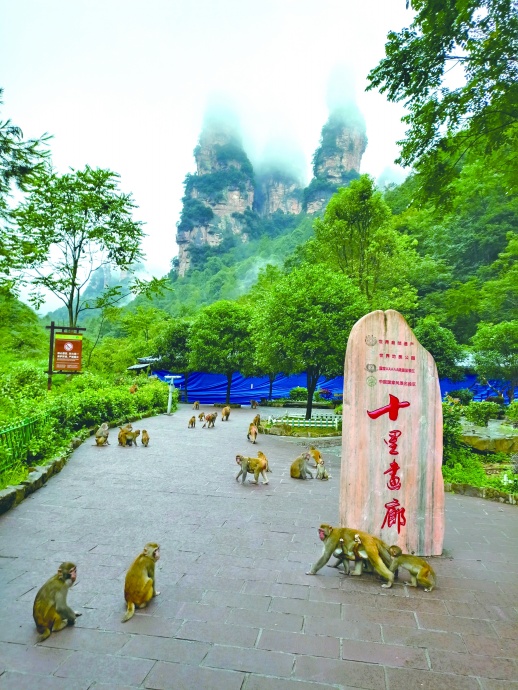 8月26日上午,张家界武陵源景区,一群猴子在游玩嬉戏。据悉,张家界发布通知表示,武陵源核心景区、天门山景区、张家界大峡谷景区于今日上午8时恢复开放。
