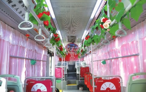 22 路公交线路是永州中心城区一条重要的线路,往返于永州育才科技职业学校与永州市中心医院之间,营运线路总长13公里,途经黄冈学校、舜德小学等十余所中小学校。一走进22路的车厢,布满“小星星”的双层粉色窗帘随风飘动,一朵朵红色玫瑰在车厢顶部拼成一颗巨大的爱心,颜色鲜艳的仿真花缠绕在栏杆和扶手上,充满浪漫气息。