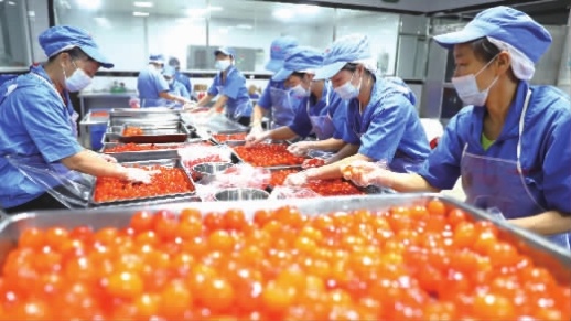 8月31日,衡东县霞流镇李花村,鸭蛋加工企业员工进行咸蛋黄分拣、包装。 湖南省衡阳市衡东县霞流镇李花村充分发挥禽蛋养殖加工传统优势,引进咸鸭蛋加工企业,带动村民年养殖鸭30万羽以上,实现年加工咸鸭蛋2.5亿枚,产值3亿元以上。