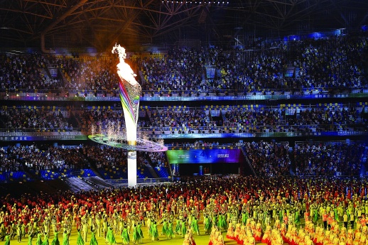 21时35分,第十四届全运会开幕式在主题歌《跨越》掀起的热烈气氛中圆满结束。