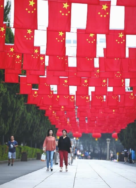 9月27日,湖南烈士公园,市民在五星红旗下游园散步。国庆将至,长沙各大公园景点以及主干道也开始换上“节日妆”,国旗飘飘,鲜花朵朵,一派喜气洋洋的景象。